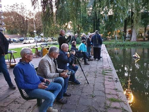 Er ook publiek aanwezig, het talud stond in de volle breedte redelijk vol. De melding op Facebook en de website hadden daaraan bijgedragen. Ook ons oud-lid Ruud Ravestein kwam even kijken. De afstand van zijn huis in de flat aan de Reggestraat naar het vaarwater was nog te overbruggen. Erg leuk om hem nog even gesproken te hebben.